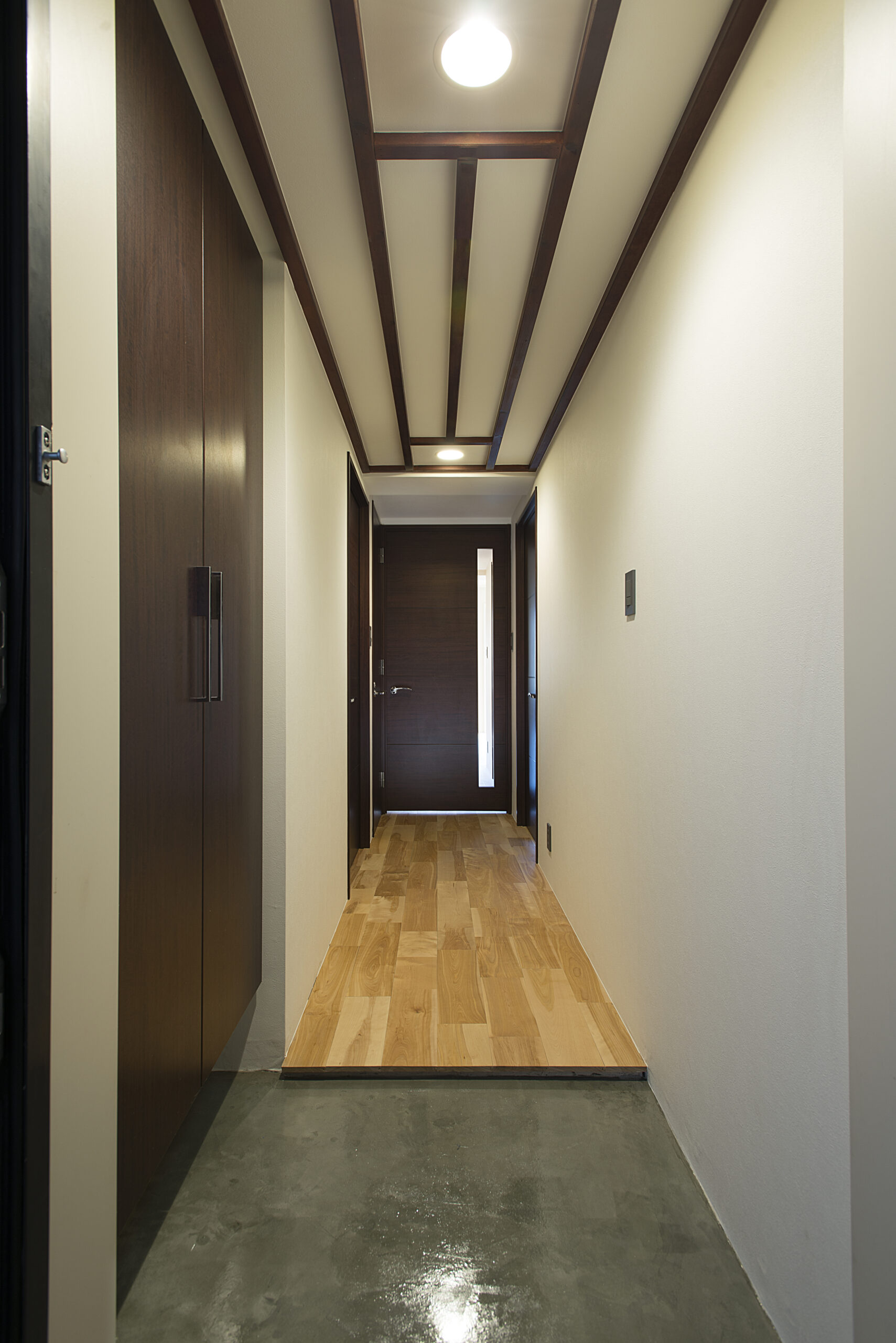 玄関は、飾り格子で装飾した天井がアクセントになっています