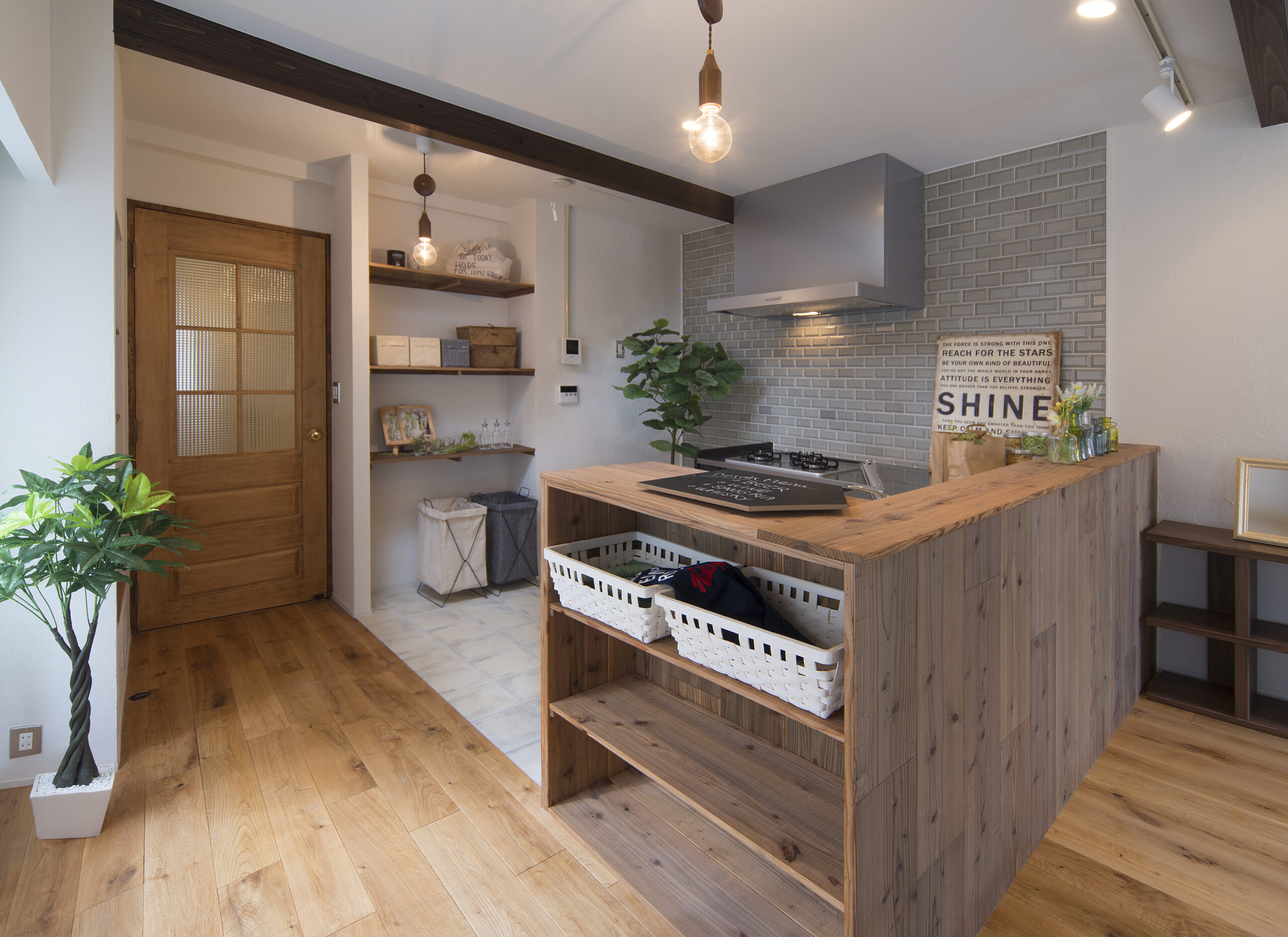 キッチンのカウンターには、味のある足場板を設置することで「みせる」収納。